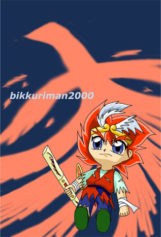 タケルの部分は、Photoshopのパス機能の実験にと、下書き線をパスでなぞった上で、それを使ってラインを引いております。・・・はっきり言って、やってみての率直な感想としては、PC上での絵を描く知識のまったくない私が挑戦するには少々無謀な挑戦であったかも、といったところでしょうか(^^;)。
