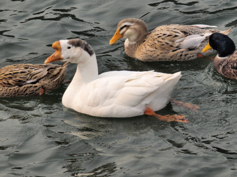 近くのダム池で白いガチョウが陸の上に1羽いました。近づいても逃げようとはしません。外来種で中国でサカツラガンを改良してつくられた家禽。しばらくすると池の中にいきマガモの小集団(雄3羽・雌3羽)の中にいました。この集団は、常に他の大集団からは離れて行動していました。