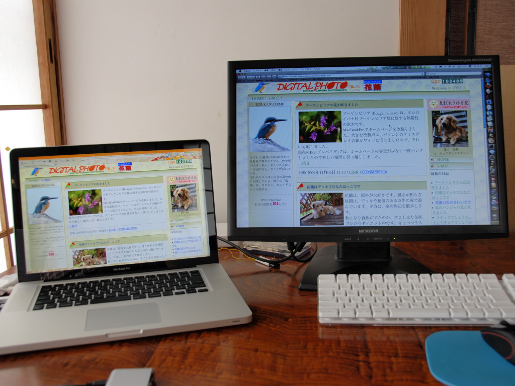 Macで簡単にローカルLANができます。 左がローカルLANのHPです。もちろんPerlやPHPも動きます。作成途中のデバックに最適です。今回、ローカルで作成しIPSにアップドードしました。ブラウザは、FireFoxです。 右がIPSのHPです。ブラウザから画像などが簡単にアップロードでき大変気に入っています。ブラウザはSafariです。