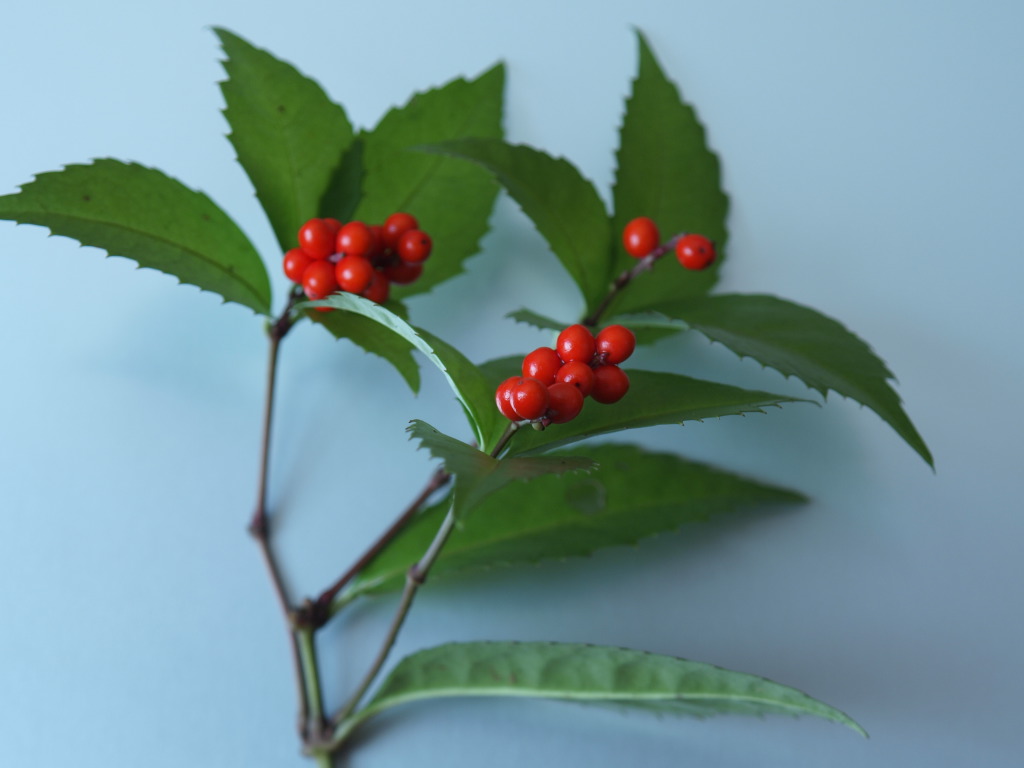 自宅の裏山で千両を見っけました。万両は実を鳥が運んで自宅庭のあちこちに自生していますが、千両が自生しているのは珍しい。 千両の上を見ると、なな実が沢山の実をつけていました。そこにメジロが集団でやってきます。 寅年の年賀状の図柄に採用しました。来る年は、穏やかで平和な一年であって欲しいと思います。