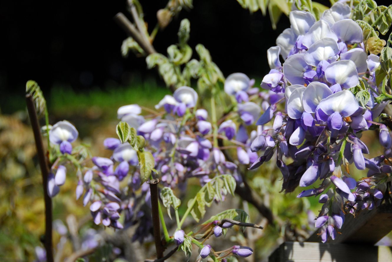 庭の藤棚の花が満開です。庭の斜面に自生した藤の蔓を伸ばし藤棚を作りました。 今年は咲くのが早いようです。5月の連休までは咲いているでしょうか?すこし心配です。 藤棚がすこし窮屈になっているようです。拡張したいのですが・・・