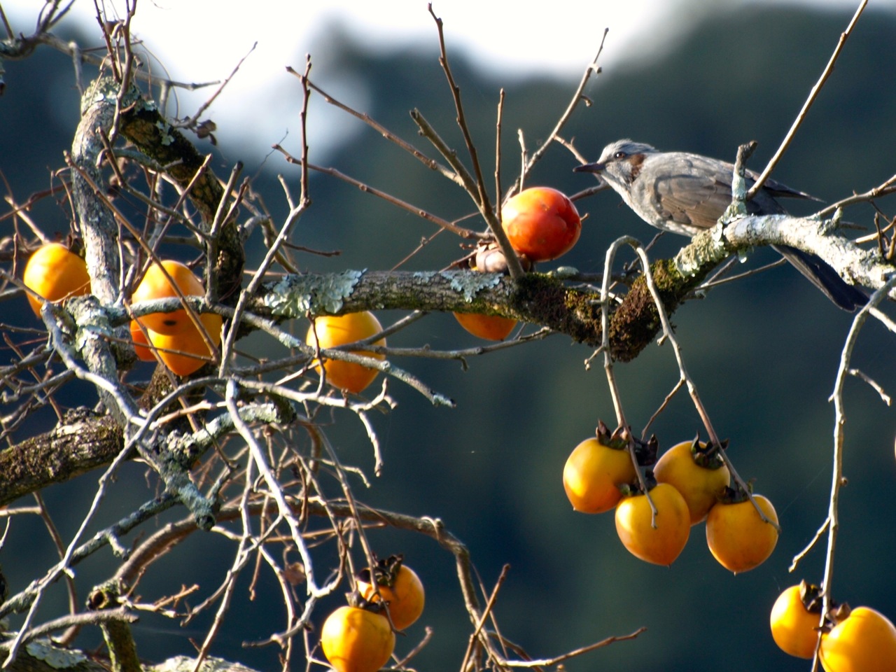 秋も深まり野鳥も里山から平野部に下りてきました。家の裏の雑木林にはメジロ、ヒヨドリ、ジジュウカラ、エナガなど見かけるようになりました。2、3日前にジョウビタキがデッキのところで家の中を伺っておりました。 ヒヨドリが家の前の柿を啄んでいました。まだ熟していないのかすぐに立ち去りました。