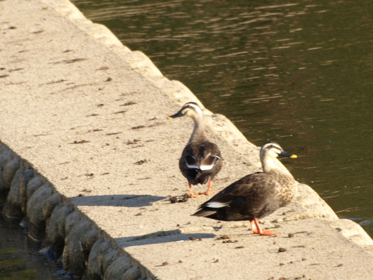 カワセミは直ぐ飛び立ちました。しばらく歩いて行くとカルガモの集団が居ました。人の気配を感じほとんどが飛び立ちましたが、残った数羽のツガイでしょうか?すこし離れている場所から撮影しました。