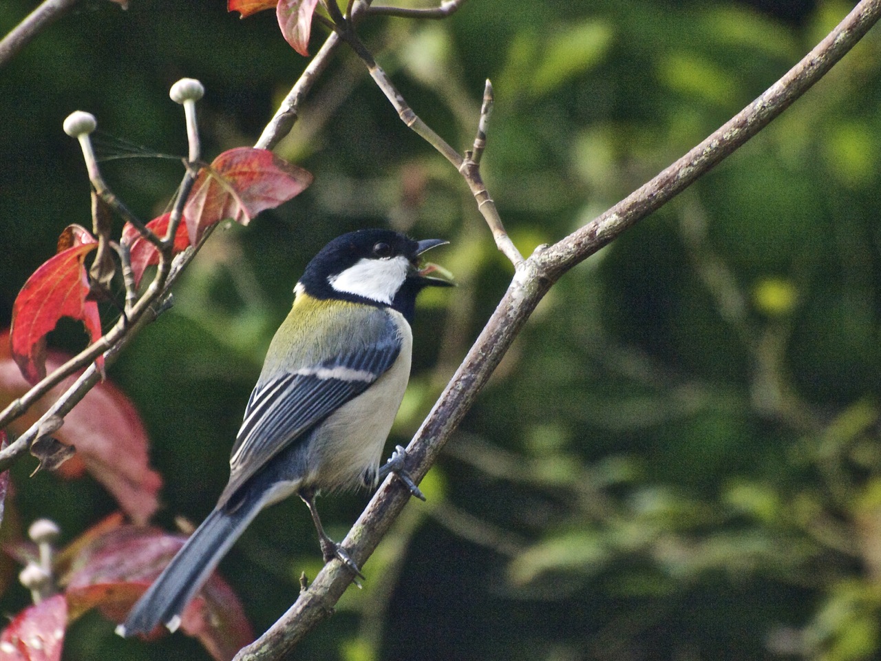 紅葉のハナミズキにシジュウカラが飛来しました。