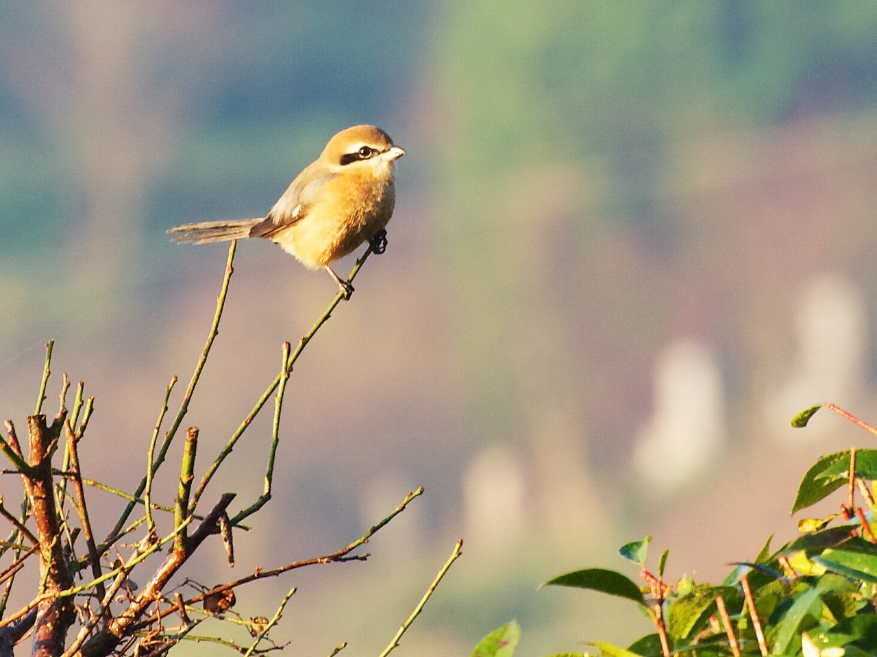 モズは葉が落ちた木の天辺によく止まります。獲物を求めて周囲を伺っているのでしょう。尾羽を上下に動かし縄張りを主張しているようです。 食べ物は、蝗虫(バッタ)や蜻蛉(トンボ)など好物のようです。寒さが増すと虫もいなくなるので何を食べるのでしょうか?