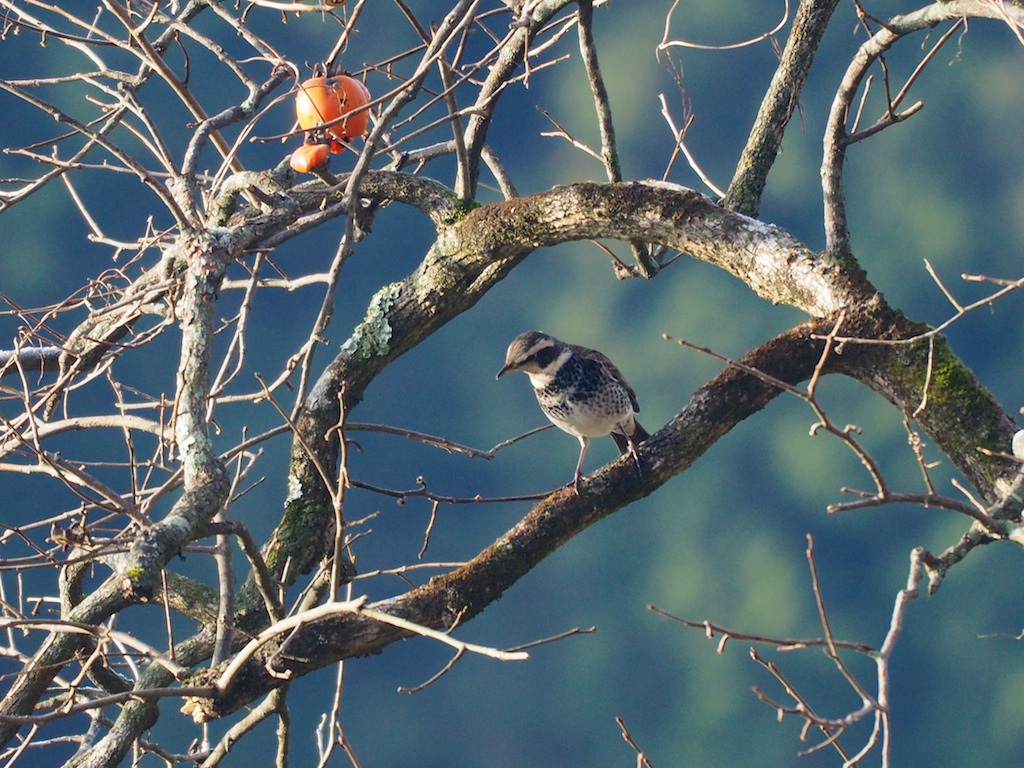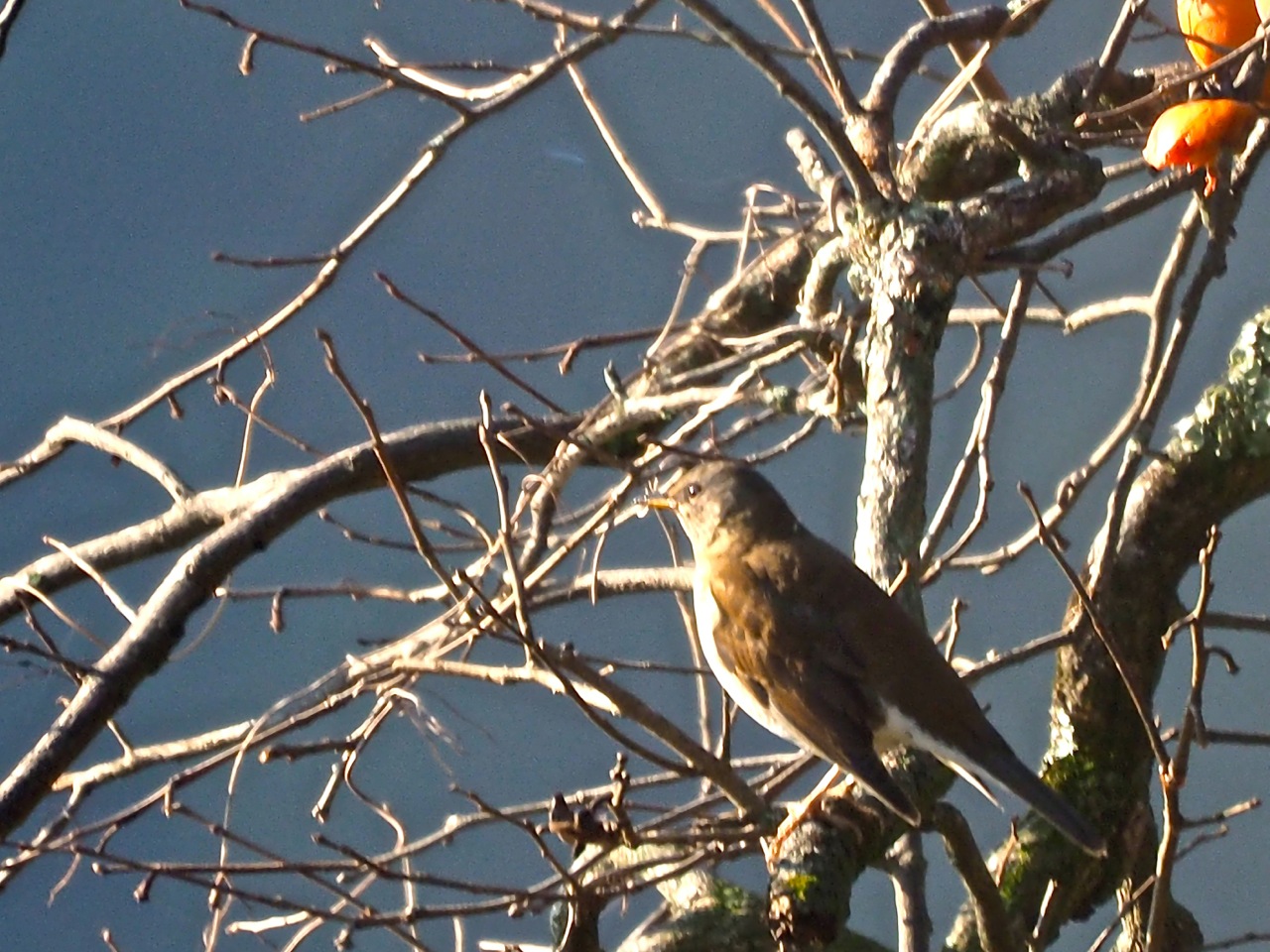 普段、シロハラは地面でカサカサと落ち葉を掻き分け餌を探します。木の枝で休憩していたのでしょうか?柿を食べる素振りはありませんでした。 気温が下がり、山には餌がなくなり熟し柿を求めてヒヨドリがよく来るようになりました。